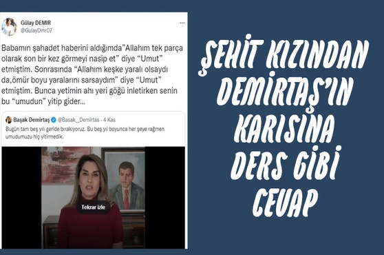 Barış Pınarı Harekatı bölgesinde, terör örgütü YPG tarafından düzenlenen saldırıda şehit düşen Mehmet Şirin Demir'in kızı gazeteci Gülay Demir, Twitter üzerinden Demirtaş'a tepki gösterdi. Şehit kızı Gülay Demir, Demirtaş'ın bu paylaşımına "Yetimin ahı yeri göğü inletirken senin umudun yitip gider" diyerek yanıt verdi.