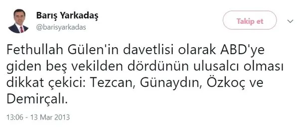 "Fethullah Gülen'in davetlisi olarak ABD'ye giden beş vekilden dördünün ulusalcı olması dikkat çekici: Tezcan, Günaydın, Özkoç ve Demirçalı."