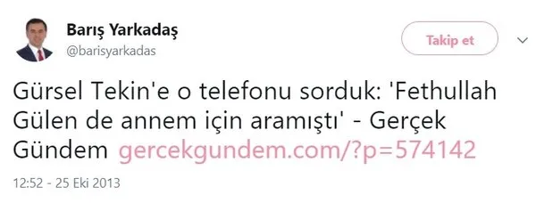 Barış Yarkadaş 25 Ekim 2013 günü ise bu kez CHP'nin önemli ismi Gürsel Tekin hakkında bir tweet atmış. Söz konusu tweette "Gürsel Tekin'e o telefonu sorduk: 'Fethullah Gülen de annem için aramıştı'" ifadelerinin kullanılması dikkat çekiyor. Mesajda aynı zamanda bir link paylaşılıyor. Yarkadaş'ın o dönem sahibi olduğu Gerçek Gündem internet sitesinden bir haberi içeren linke şu an ulaşılamaması dikkat çekiyor. Linke tıklandığında anasayfaya yönlendirme yapılıyor.