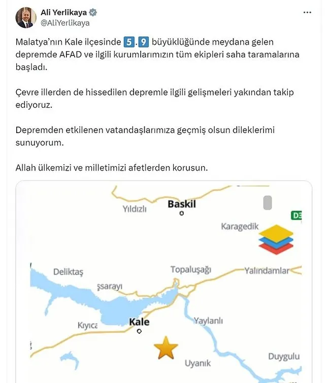 Yerlikaya, sosyal medya hesabından yaptığı açıklamada, "Malatya'nın Kale ilçesinde 5,9 büyüklüğünde meydana gelen depremde AFAD ve ilgili kurumlarımızın tüm ekipleri saha taramalarına başladı." ifadelerini kullandı.
