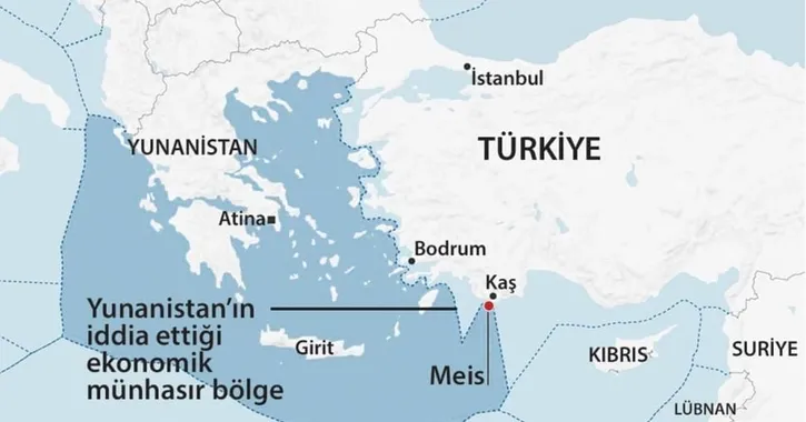Yazıda, BM Deniz Hukuku Sözleşmesi'ne göre, münhasır ekonomik bölgelerin sınırları 'kıta sahanlığı' temelinde belirlenmesine ve Türkiye'nin daha uzun bir kıyı şeridine sahip olmasına rağmen, Yunanistan'ın karasularını '12 mil' olarak iddia ettiği ve Ege Denizi'ni ekonomik olarak tamamen Yunan olduğunu savunduğu belirtilerek, Meis adasının Türk kıyılarından sadece 2 kilometre, Yunan anakarasına ise 500 kilometre uzakta olduğuna dikkat çekildi.