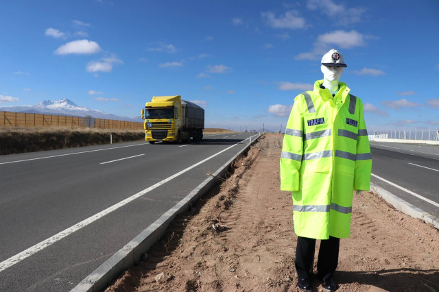 Kayseri İl Emniyet Müdürlüğü, trafik kazaların azalması ve sürücülerin daha dikkatli olmasını sağlamak amacıyla, şehir dışındaki ana yollara manken polis yerleştirdi.