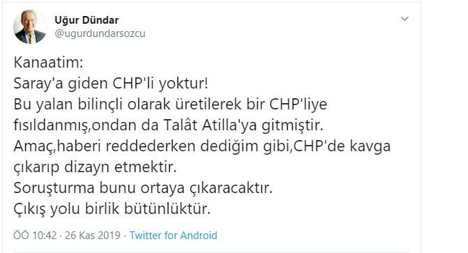 "Kanaatim: Saray'a giden CHP'li yoktur! Bu yalan bilinçli olarak üretilerek bir CHP'liye fısıldanmış, ondan da Talât Atilla'ya gitmiştir. Amaç, haberi reddederken dediğim gibi, CHP'de kavga çıkarıp dizayn etmektir. Soruşturma bunu ortaya çıkaracaktır. Çıkış yolu birlik bütünlüktür" dedi.