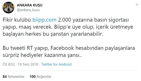 Dikkat çeken bir diğer paylaşımlardan biri de 'Ankara Kuşu' hesabından 19 Temmuz 2018 günü yapılan bir reklam oldu. Reklam'da 'Fikir Kulübü biipp.com' ismiyle bir sitenin tanıtımı yapıldı. Tweettte; "Fikir kulübü biipp.com 2.000 yazarına basın sigortası yapıp, maaş verecek. Biipp'e üye olup, içerik üretmeye başlayan herkes bu şanstan yararlanabilir. Bu tweeti RT yapıp, Facebook hesabından paylaşanlara sürpriz hediyeler kazanma şansı..." yazdığı görülüyor.