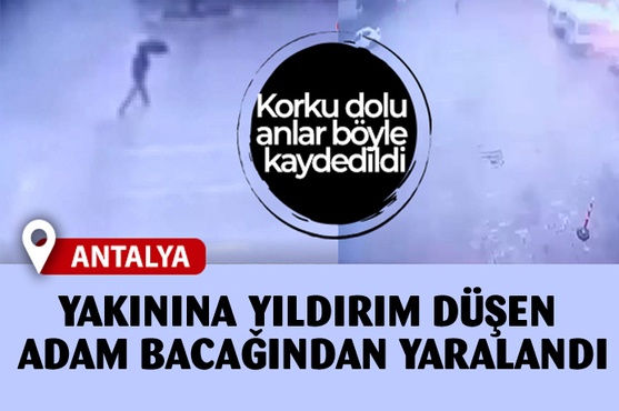 Antalya’da şemsiye ile yürüyen kişi, yakınına yıldırım düşmesi sonucu bacaklarından yaralandı. Yıldırımın düştüğü anlar anbean güvenlik kamerasına yansıdı.