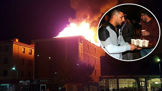 Erzincan kent merkezinde bir binanın çatısında çıkan yangın yaklaşık 2 saatte söndürülebildi. İtfaiye ekipleri çatıdaki alevlere müdahale ettiği sırada, yakındaki bir kafeden, görevli ve izleyenlere çay servisi yapıldı