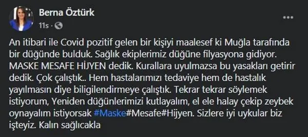 Sosyal medyadan yaptığı paylaşımda Öztürk, "An itibari ile Kovid pozitif gelen bir kişiyi maalesef ki Muğla tarafında bir düğünde bulduk. Sağlık ekiplerimiz düğüne filyasyona gidiyor. Maske, mesafe, hijyen dedik. Kurallara uyulmazsa bu yasakları getirir dedik. Çok çalıştık. Hem hastalarımızı tedaviye hem de hastalık yayılmasın diye bilgilendirmeye çalıştık. Tekrar tekrar söylemek istiyorum, yeniden düğünlerimizi kutlayalım, el ele halay çekip zeybek oynayalım istiyorsak maske, mesafe, hijyen. Sizlere iyi uykular biz işteyiz. Kalın sağlıcakla" dedi.