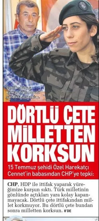 CHP'li milletvekillerinin terörist cenazelerine katılarak gözyaşı döktüğü görüntüler arşivlerde dururken, skandallara bir yenisini daha ekledi. 30 Mart yerel seçimleri öncesi şehitlikteki programa katılan CHP belediye başkan adayı ve ilçe başkanı, kendilerine tepki gösteren 15 Temmuz Şehidi Cennet Yiğit'in babası Yahya Kemal Yiğit'e iftira atıp, dava açtı. Şehit babasının kendisine yumruk attığını ve hakaret eğittiğini öne süren CHP'lilerin yalanı, olay günü çekilen videolarla çürütüldü. Bu da yetmiyormuş gibi CHP İl Başkanı, 10 avukat ve bir otobüs partiliyle duruşmaya giderek gövde gösterisi yaptı. Şehit babası Yahya Kemal Yiğit ise; "Damarlarınızda Türk kanı varsa ve yüreğiniz yetiyorsa, gövde gösterisini PKK-HDP' ye yapın" dedi.