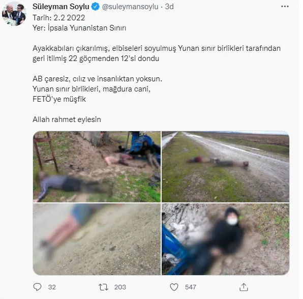 Yunanistan'ın göçmenlere uyguladığı insanlık dışı harekete sert tepki gösteren Bakan Soylu, "Ayakkabıları çıkarılmış, elbiseleri soyulmuş Yunan sınır birlikleri tarafından geri itilmiş 22 göçmenden 12'si dondu" ifadelerini kullandı.