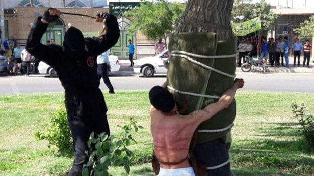 İran medyasında yayımlanan fotoğraflarda kimliği sadece "M R" olarak açıklanan bir kişi, ülkenin doğusundaki Kaşmar kentinde kırbaçlanırken görülüyor.
