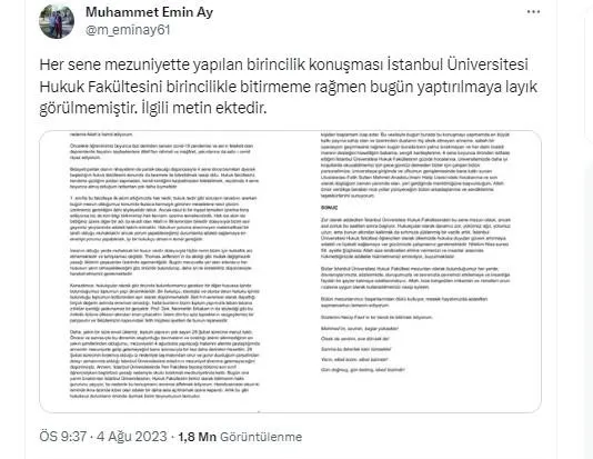 İstanbul Üniversitesi Hukuk Fakültesi öğrencisi Muhammet Emin Ay, mezuniyet töreninde bölümü birincilikle bitirenlere tanınan konuşma hakkının kendisine verilmediğini öne sürdü. Konuşma metnini daha sonra sosyal medyadan paylaşan paylaşan Ay'ın, 28 Şubat'a ve Necmettin Erbakan'a atıf yapması dikkat çekti. İstanbul Üniversitesi rektörlüğü ise yaptığı açıklamada iddiaya ilişkin inceleme başlattığını duyurdu.