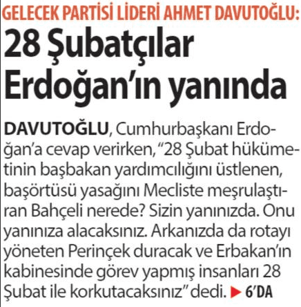 Her gün 28 Şubatçı CHP ile görüşmeler yapıp, 28 Şubatçıları cezaevine gönderen Erdoğan'ı indirmeyi hedefleyenlerle ittifaka hazırlanan Gelecek Partisi Genel Başkanı Ahmet Davutoğlu, Erdoğan-Bahçeli ittifakını, "28 Şubatçılar Erdoğan'ın yanında." sözleri ile yorumladı.