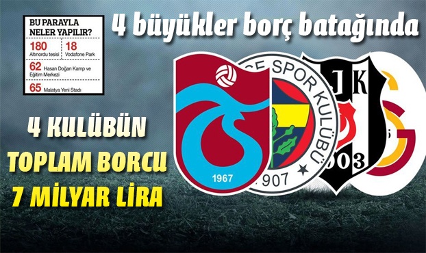 Gazete Habertürk'ün haberine göre; atalarımız ne güzel demiş: Ayağını yorganına göre uzatacaksın... Ama gelin görün ki Türk futbolunun lokomotifi olarak görünen 4 büyükler ayaklarını yorganın dışına fazlasıyla çıkarmış durumdalar. Niye mi? İşte özeti: Beşiktaş,Fenerbahçe, Galatasaray ve Trabzonspor’un borcu 7 milyar lirayı aştı.