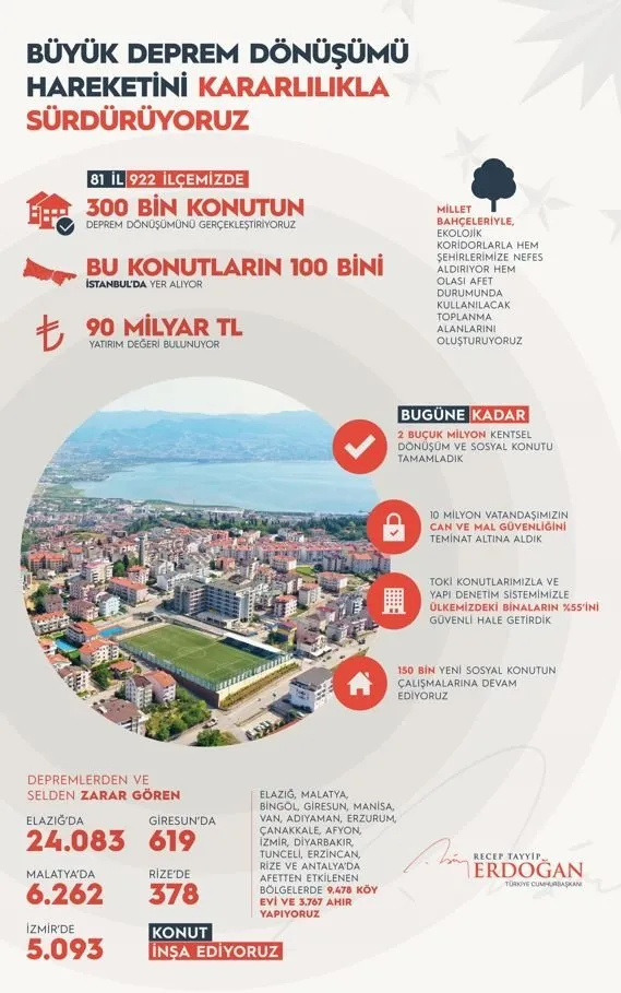 "Millet bahçeleriyle, ekolojik koridorlarla hem şehirlerimize nefes aldırıyor hem olası afet durumunda kullanılacak toplanma alanlarını oluşturuyoruz. Bugüne kadar 2,5 milyon kentsel dönüşüm ve sosyal konutu tamamladık. 10 milyon vatandaşımızın can ve mal güvenliğini teminat altına aldık. TOKİ konutlarımızla ve yapı denetim sistemimizle ülkemizdeki binaların yüzde 55'ini güvenli hale getirdik. 150 bin yeni sosyal konutun çalışmalarına devam ediyoruz. Depremlerden ve selden zarar gören Elazığ'da 24 bin 83, Malatya'da 6 bin 262, İzmir'de 5 bin 93, Giresun'da 619, Rize'de 378 konut inşa ediyoruz. Elazığ, Malatya, Bingöl, Giresun, Manisa, Van, Adıyaman, Erzurum, Çanakkale, Afyon, İzmir, Diyarbakır, Tunceli, Erzincan, Rize ve Antalya'da afetten etkilenen bölgelerde 9 bin 478 köy evi ve 3 bin 767 ahır yapıyoruz."