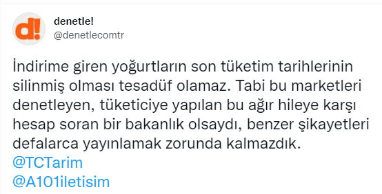 "İndirime giren yoğurtların son tüketim tarihlerinin silinmiş olması tesadüf olamaz. Tabi bu marketleri denetleyen, tüketiciye yapılan bu ağır hileye karşı hesap soran bir bakanlık olsaydı, benzer şikayetleri defalarca yayınlamak zorunda kalmazdık."