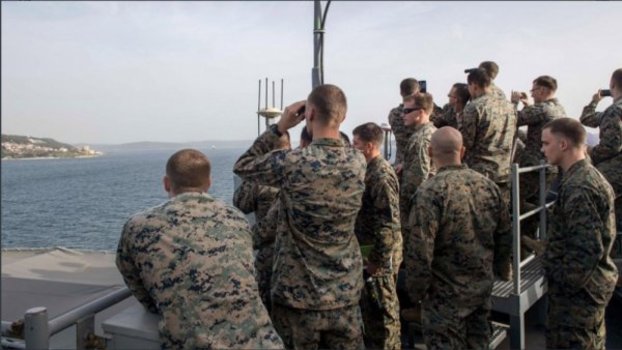 Spring Storm 2018 tatbikatı için Romanya’ya giden ABD donanmasına ait Oak Hill Savaş Gemisi, Çanakkale Boğazı’ndan geçerken gemide görevli personel Tarihi Gelibolu Yarımadası’nı dürbünle seyretti.