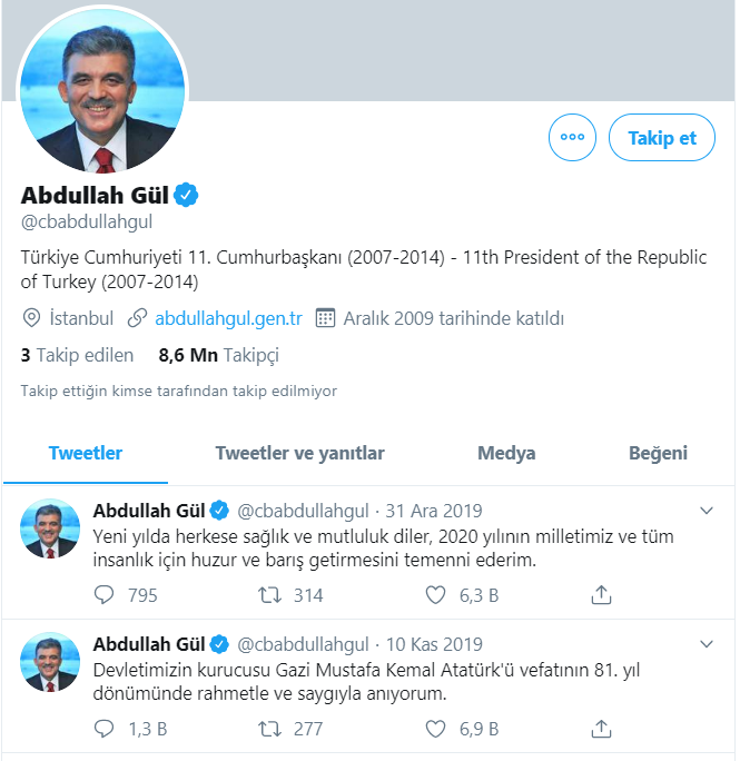 Sosyal medya hesabından paylaşımda bulunan Gül, "Yeni yılda herkese sağlık ve mutluluk diler, 2020 yılının milletimiz ve tüm insanlık için huzur ve barış getirmesini temenni ederim." ifadelerini kullandı.