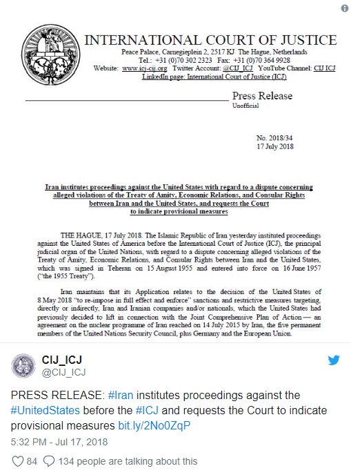 İran, 2015'te varılan nükleer anlaşmadan çekilerek Mayıs ayında kendisine yeniden yaptırım uygulamaya başlayan ABD ile arasındaki anlaşmazlığı BM'nin yargı organı olan Uluslararası Adalet Divanı'na (UAD) taşıdı. İran ABD'den, anlaşmadan çekildiği 8 Mayıs tarihinden itibaren yeniden yürürlüğe sokulan yaptırımları ve yeni yaptırım tehditlerini "derhal sonlandırmasını" talep ediyor. İran, ABD'nin yaptırımlarının "onarılamaz zarara" yol açacağını savundu.