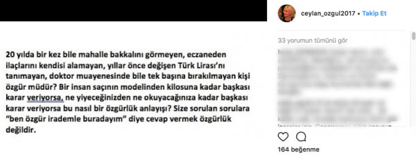 Oktar'ın yanından kaçtığını söyleyen Ceylan Özgül, Instagram hesabından da dikkat çeken paylaşımlar yaptı.