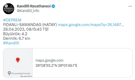 İçişleri Bakanlığı Afet ve Acil Durum Yönetimi Başkanlığı (AFAD) verilerine göre; Hatay'ın Samandağ ilçesinde saat 08.15'te 4.1 şiddetinde deprem meydana geldi.