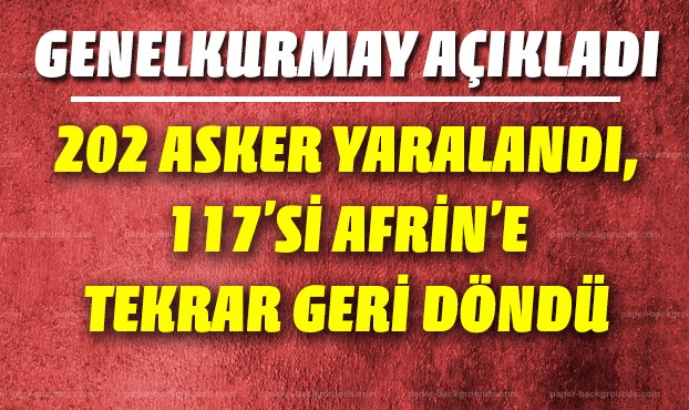TSK'dan yapılan açıklamada, "Zeytin Dalı Harekatı'nda yaralanan 117 kahraman silah arkadaşımızın tedavileri tamamlanmış ve görevlerine dönmüşlerdir" ifadesi kullanıldı.