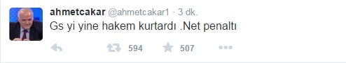 Karşılaşma devam ederken Çakar, "Gs yi yine hakem kurtardı .Net penaltı" şeklinde bir tweet attı.