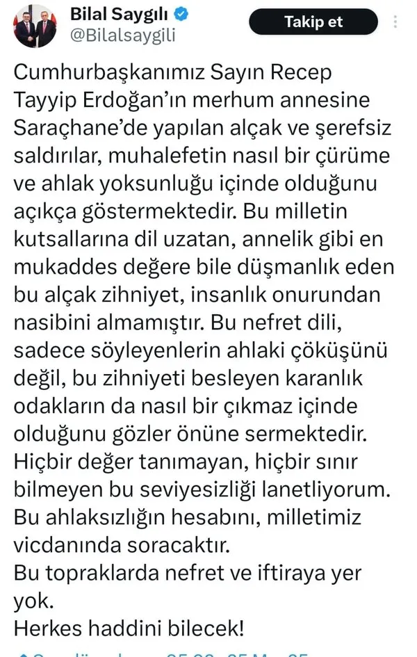 Saraçhane'de hakaret içerikli söylemlere bir tepki de AK Parti İzmir İl Başkanı Bilal Saygılı'dan geldi. Saygılı konuya ilişkin olarak yaptığı açıklamada: "Cumhurbaşkanımız Sayın Recep Tayyip Erdoğan'ın merhum annesine Saraçhane'de yapılan alçak ve şerefsiz saldırılar, muhalefetin nasıl bir çürüme ve ahlak yoksunluğu içinde olduğunu açıkça göstermektedir. Bu milletin kutsallarına dil uzatan, annelik gibi en mukaddes değere bile düşmanlık eden bu alçak zihniyet, insanlık onurundan nasibini almamıştır. Bu nefret dili, sadece söyleyenlerin ahlaki çöküşünü değil, bu zihniyeti besleyen karanlık odakların da nasıl bir çıkmaz içinde olduğunu gözler önüne sermektedir. Hiçbir değer tanımayan, hiçbir sınır bilmeyen bu seviyesizliği lanetliyorum. Bu ahlaksızlığın hesabını, milletimiz vicdanında soracaktır. Bu topraklarda nefret ve iftiraya yer yok. Herkes haddini bilecek!" ifadelerini kullandı.
