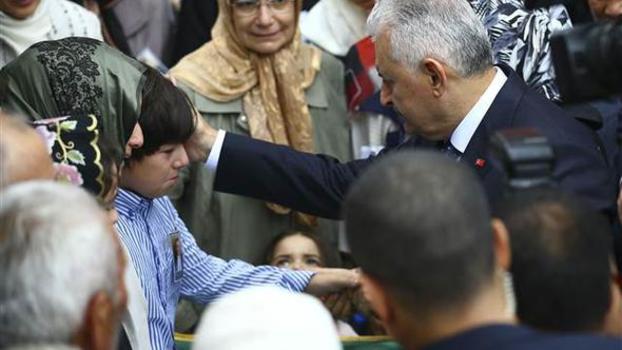 Cenaze törenine katılan Başbakan Binali Yıldırım, Tütüncü'nün oğlu Hüseyin Kağan'ı teselli etmeye çalıştı.
