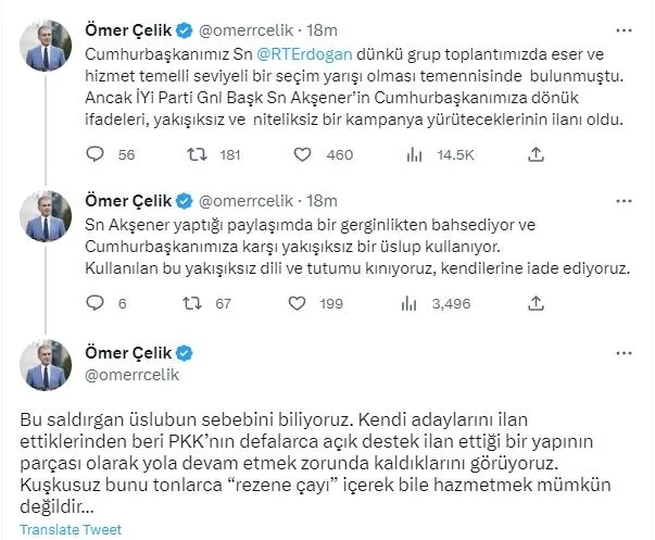 İyi Parti Genel Başkanı Meral Akşener'in Başkan Recep Tayyip Erdoğan'a yönelik ifadelerine AK Parti'den sert tepki geldi. AK Parti Sözcüsü Ömer Çelik, sosyal medyadan yaptığı açıklamada, "Bu saldırgan üslubun sebebini biliyoruz. Kendi adaylarını ilan ettiklerinden beri PKK'nın defalarca açık destek ilan ettiği bir yapının parçası olarak yola devam etmek zorunda kaldıklarını görüyoruz. Kuşkusuz bunu tonlarca "rezene çayı" içerek bile hazmetmek mümkün değildir…"