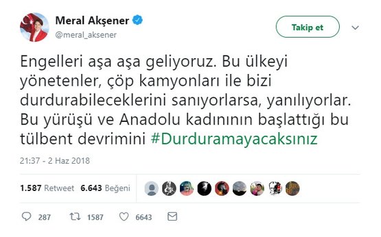 İP Genel Başkanı Meral Akşener, sosyal paylaşım sitesi Twitter'daki şahsi hesabından açıklamada bulundu. Akşener, "Bu milletin kaynaklarıyla önümüze engeller dikenlerin devri bitiyor. Engelleri aşa aşa, tuzakları boza boza geliyoruz. Engelleri aşa aşa geliyoruz. Bu ülkeyi yönetenler, çöp kamyonları ile bizi durdurabileceklerini sanıyorlarsa, yanılıyorlar. Bu yürüyüşü ve Anadolu kadınının başlattığı bu tülbent devrimini #Durduramayacaksınız" iddiasında bulundu.