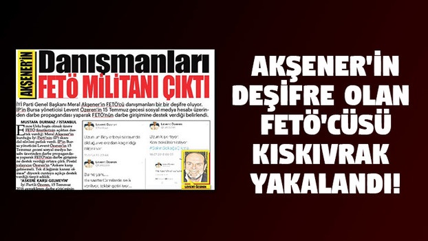 Gazetemiz Akit’in “Danışmanları FETÖ’cü çıktı” başlıklı haberi büyük yankı uyandırdı. 250 şehit verdiğimiz ihanet gecesinde, darbecilere direnenlere öfke kusan İyi Parti’nin Bursa yöneticisi Levent Özeren’in gözaltına alındığı ortaya çıktı.