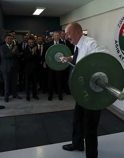 Spora düşkünlüğüyle bilinen 60 yaşındaki Aliyev'in ceketini çıkartarak tek hamlede 60 kiloluk halteri kaldırdığı görüntüler renkli anlara sahne olurken, Cumhurbaşkanı Erdoğan ve Dünya Halter Şampiyonu Halil Mutlu o anları şaşkınlıkla izledi.
