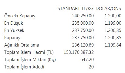 KMKTP'de, altında gerçekleşen toplam işlem hacmi 153 milyon 170 bin 387,32 lira, işlem miktarı ise 647 kilogram oldu. Tüm metallerdeki toplam işlem hacmi ise 155 milyon 51 bin 416,81 lira oldu.