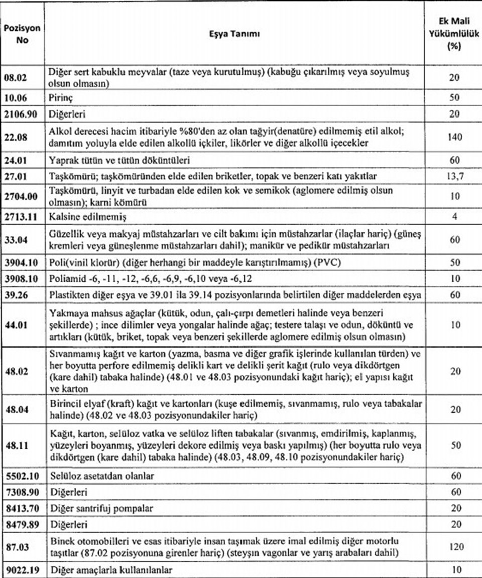 Yapılan düzenleme ile kuruyemiş ürünlerine yüzde 20, prince yüzde 50'ye, alkol oranı yüzde 80'den az olan içeceklere yüzde 140, tütün ürünlerine yüzde 60 ve binek otomobillere yüzde 120 ek vergi uygulanacak.