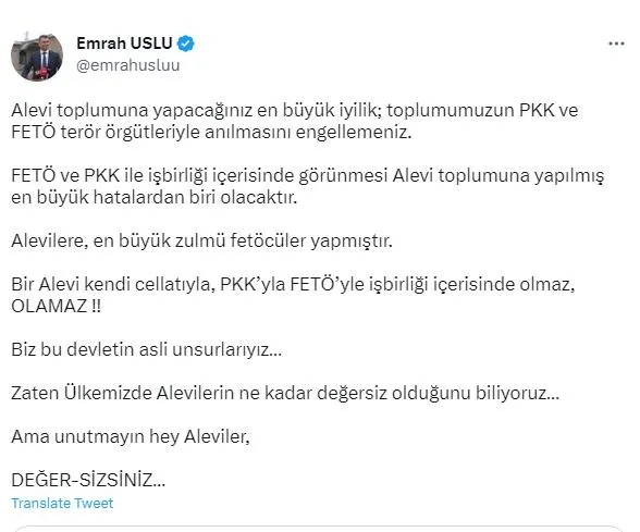 Alevi toplumuna yapacağınız en büyük iyilik; toplumumuzun PKK ve FETÖ terör örgütleriyle anılmasını engellemeniz. FETÖ ve PKK ile işbirliği içerisinde görünmesi Alevi toplumuna yapılmış en büyük hatalardan biri olacaktır. Alevilere, en büyük zulmü fetöcüler yapmıştır. Bir Alevi kendi cellatıyla, PKK'yla FETÖ'yle işbirliği içerisinde olmaz, OLAMAZ !! Biz bu devletin asli unsurlarıyız… Zaten Ülkemizde Alevilerin ne kadar değersiz olduğunu biliyoruz… Ama unutmayın hey Aleviler, DEĞER-SİZSİNİZ…