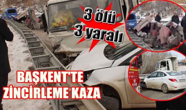 Ankara’da kamyonet ile 2 otomobilin çarpışması sonucu meydana gelen kazada 3 kişi öldü, 3 kişi yaralandı.