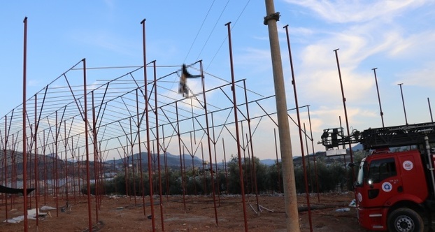 Olay, Antalya'nın Gazipaşa ilçesinde meydana geldi. Edinilen bilgiye göre Korubaşı Mahallesi'nde bir sera inşaatında çalışan Sait Yunt (20) , yaklaşık 5 metre yüksekte sera demirlerini monte ederken elindeki demir çubuk hemen üzerinden geçen yüksek gelirim hattının tellerine değdi . Çarpmanın şiddetiyle savrulan işçi Sait Yunt, seranın yaklaşık 5 metre demir iskeletleri üzerinde asılı kaldı. Olaya şahit olan diğer işçilerin ihbarı üzerine olay yerine itfaiye ve sağlık ekipleri çağrıldı.Yaklaşık yarım saat demir iskeleler üzerinde asılı kalan Sait Yunt'un cenazesi, elektrik şirketinin hattaki elektriği kesmesinin ardından Antalya Büyükşehir Belediyesi ekipleri tarafından bulunduğu yerden indirildi.