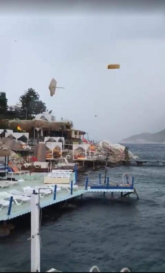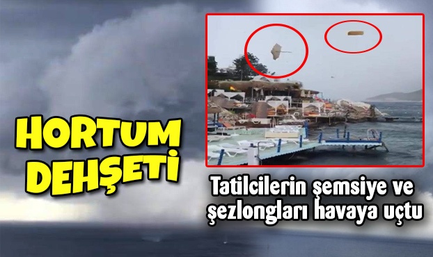 Sahildeki bir otelin plajına gelen hortum, tatilcilerin malzemeleri ile şezlongları uçurdu. O anlar ise vatandaşlar cep telefonuyla saniye saniye kaydetti.