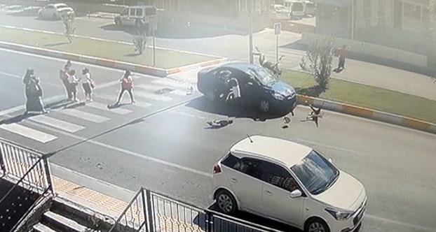 Antalya'nın Manavgat ilçesi Emniyet Müdürlüğü karşısında yaya geçidini kullanan yayalara otomobilin çarpması sonucu anne ve 2 kızı yaralandı. Kaza anı bir iş yerinin güvenlik kamerasına saniye saniye yansıdı.