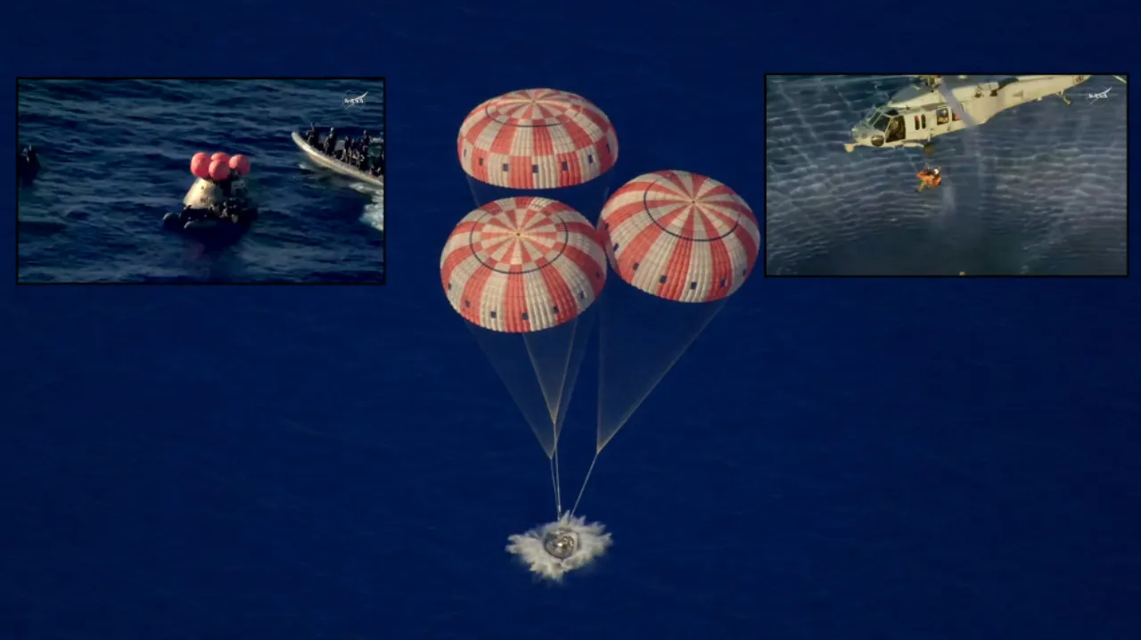 Atmosfere ses hızının 35 katı hızla giren ve 5.000 dereceyi bulan kavurucu sıcaklıkları ısı kalkanıyla bertaraf eden Orion, üç ana paraşütünün açılmasıyla okyanusa yumuşak bir iniş yaptı.