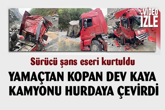 Artvin'de yamaçtan kopan dev kaya kamyonu hurdaya çevirdi