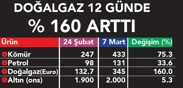 Brent tipi petrol 139 dolara kadar çıkarak 2008'de tarihi rekor olan 143 dolara yaklaştı. Petrolde savaşın başladığı 24 Şubat'tan bu yana yaşanan artış yüzde 33.2 oldu. Yatırımcıların güvenli limanlara yönelimi ile altının ons fiyatı da yükselişini sürdürdü ve Asya seansında Ağustos 2020'den bu yana ilk kez 2.000 doları test etti.
