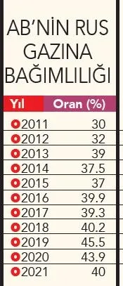 Ancak bu korkular arzın duracağı anlamına gelmiyor" ifadelerini kullandı. AB ülkelerinin Rus gazına bağımlılığı 2011 yılından beri hızla artıyor. Uluslararası Enerji Ajansı verilerine göre, Avrupa'nın geçen yıl Rusya'dan ithal ettiği 155 milyar metreküp gaz, toplam ithalatının yüzde 45'ini ve toplam gaz tüketiminin yüzde 40'ını oluşturdu.
