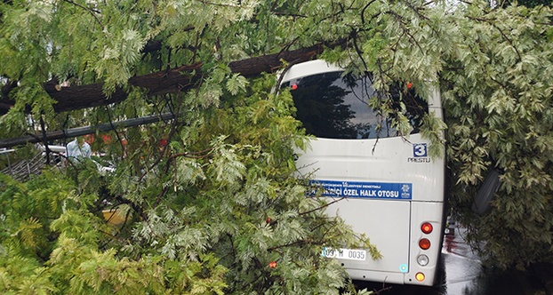 Aydın’da akşam saatlerinde etkili olan şiddetli sağanak yağış ve fırtına ya dayanamayan çınar ağacı ve aydınlatma direği Aydın Şehiriçi Özel Halk Minibüsünün üstüne devrildi. Mimar Sinan Mahallesinden, Ata Mahallesine yolcu taşıyan Basri Yaman idaresindeki 09 M 0035 plakalı 3 nolu Özel Şehiriçi Minibüsü Aydın Adnan Menderes Bulvarı üzerinde yolcu almak için durağa yanaştı. Şiddetli rüzgar ve fırtınaya dayanamayan orta refüjdeki çınar ağacı bir anda şehiriçi minibüsünün üstüne devrildi. Şans eseri olayda ölen yada yaralanan olmadı.