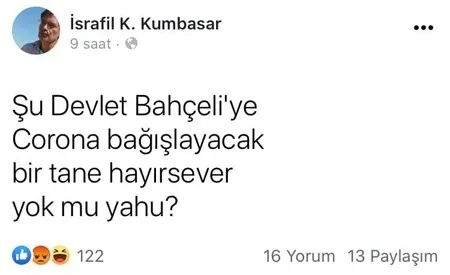 Avukat İsrafil Kumbasar (Yeyin), geçtiğimiz günlerde sosyal medya hesabı üzerinden MHP lideri Devlet Bahçeli hakkında "Şu Devlet Bahçeli'ye korona bağışlayacak bir hayırsever yok mu?" şeklinde paylaşımda bulunmuştu. Söz konusu paylaşım sonrası Avukat Kumbasar, savcılığa ihbar edildi.