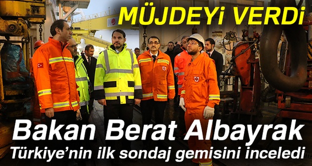 Enerji ve Tabii Kaynaklar Bakanı Berat Albayrak, Kocaeli Körfezi’ne demirleyen Türkiye’nin ilk sondaj gemisini ziyaret ederek, çalışmaları hakkında bilgi aldı. Gemi personeli ile bir araya gelen Bakan Albayrak, 2017 yılının kısa değerlendirmesini yaptı. Her yılsonu, sektörün bir firmasında yeni yıla girdiklerini hatırlatan Bakan Berat Albayrak, “Bu yıl Enerji ve Tabii Kaynaklar Bakanlığı açısından rekorların yılı oldu. Türkiye enerji tarihi açasından milat olan, 2017 yılında sözünü verdiğimiz ve yıl bitmeden ülkemize ulaşan, sektörün en büyüğü, son teknoloji gemilerinden, ülkemizin ilk sondaj gemisinde yeni yıla giriyoruz. 230 metre uzunluğunda, 36 metre genişliğinde, dünyanın en gelişmiş sondaj gemilerinden bir tanesi. Yeni yıla buradaki arkadaşlar ile girelim istedik” dedi.