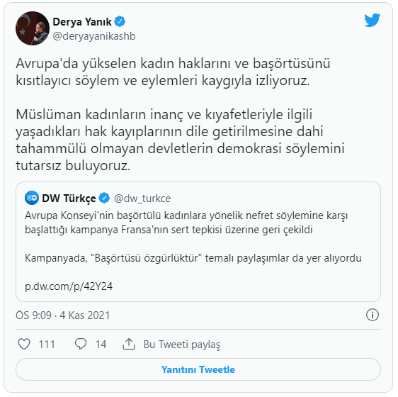 Aile ve Sosyal Hizmetler Bakanı Derya Yanık, Fransa'nın Avrupa Konseyinin başörtülü kadınlara yapılan ayrımcılığa karşı başlattığı kampanyayı iptal ettirmesine tepki gösterdi.