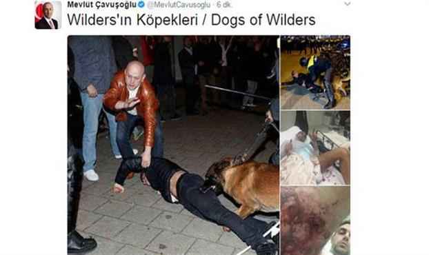 Dışişleri Bakanı Mevlüt Çavuşoğlu, Hollanda polisinin köpekli saldırısına ilişkin şok fotoğrafları twitter hesabından paylaştı. Çavuşoğlu, "Wilders'in köpekleri / Dogs of Wilders' diye yazdı. Öte yandan AA'nın haberine göre Hollanda hükümetinin diplomatik skandala neden olan uygulamalarını protesto etmek için Türkiye'nin Rotterdam Başkonsolosluğu önünde toplanan binlerce kişiye dün gece atlı polisler ve köpekler ile müdahale eden polis, en az 7 kişinin yaralanmasına neden oldu. Rotterdam polisi 12 kişinin gözaltına alındığını duyurdu.