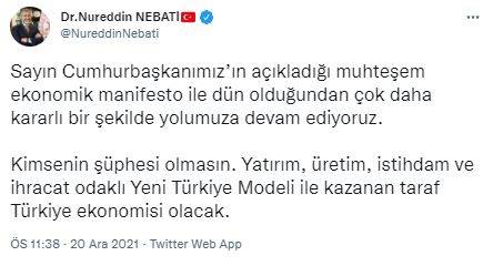 Hazine ve Maliye Bakanı Nurettin Nebati: Sayın Cumhurbaşkanımız’ın açıkladığı muhteşem ekonomik manifesto ile dün olduğundan çok daha kararlı bir şekilde yolumuza devam ediyoruz. Kimsenin şüphesi olmasın. Yatırım, üretim, istihdam ve ihracat odaklı Yeni Türkiye Modeli ile kazanan taraf Türkiye ekonomisi olacak.