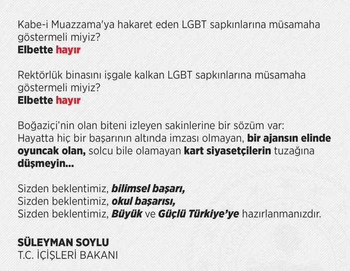 Son dakika haberi: İçişleri Bakanı Süleyman Soylu, Boğaziçi Üniversitesi'ndeki provokasyonlara sosyal medyadan tepki gösterdi. Soylu, “Boğaziçi’nin olan biteni izleyen sakinlerine bir sözüm var: Hayatta hiç bir başarının altında imzası olmayan, bir ajansın elinde oyuncak olan, solcu bile olamayan kart siyasetçilerin tuzağına düşmeyin” ifadelerini kullandı.